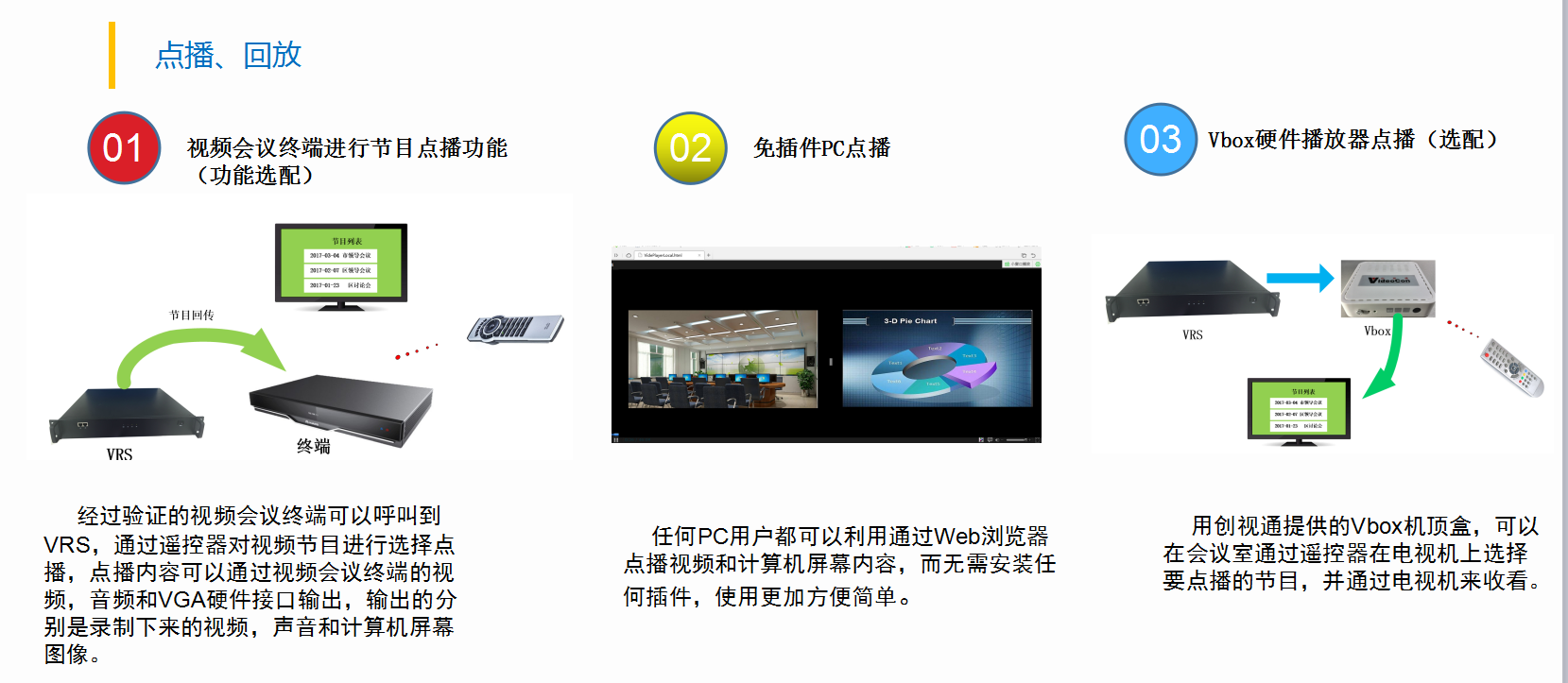 1.具備用視頻終端的遙控器點播全部錄制的會議內容能力可以用遙控器實現會議節目的選擇、密碼輸入、開始、暫停、停止等控制.