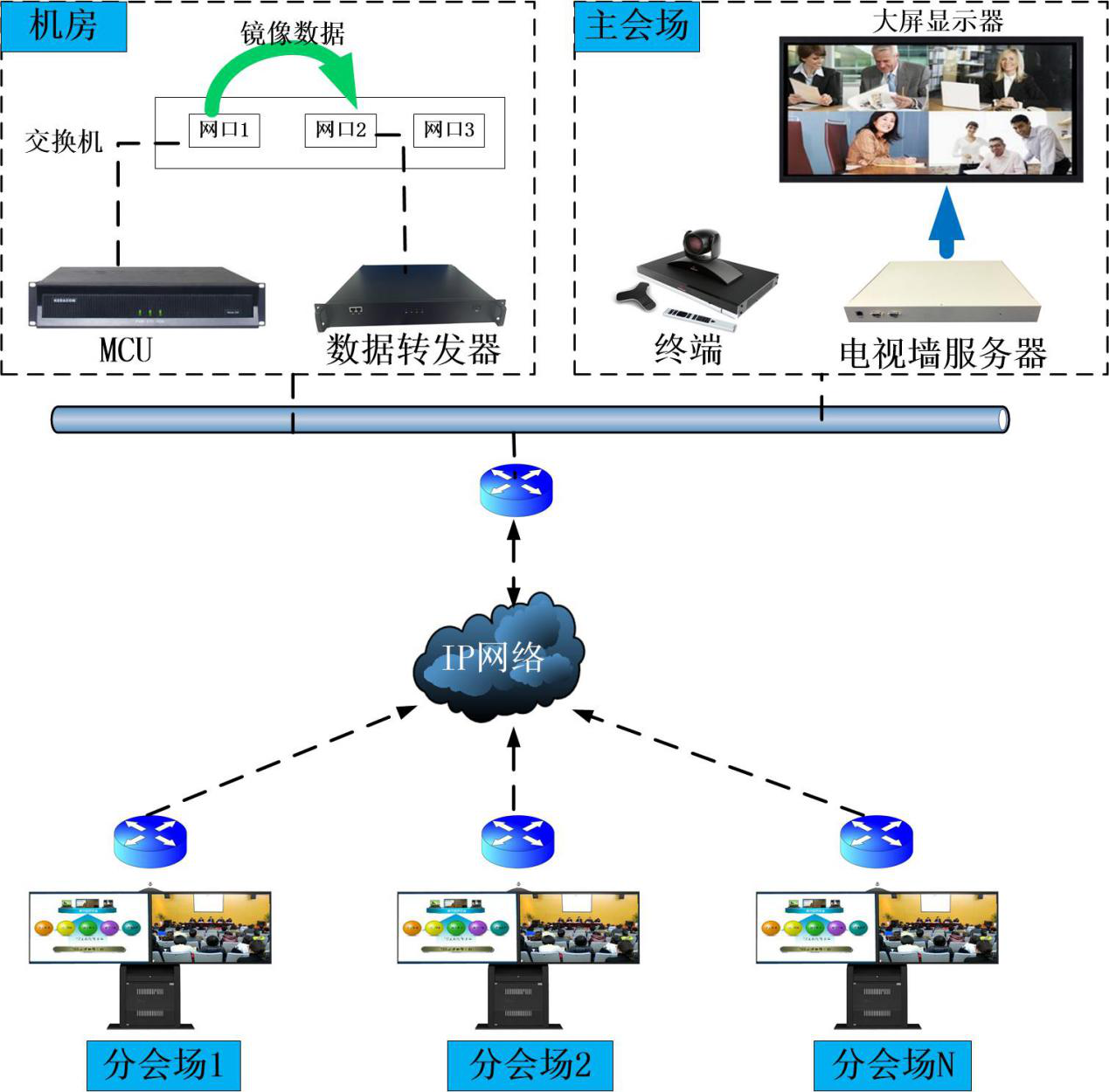 · 多會議共享:不同會議的分會場畫面可以同時顯示在一個電視墻服務器上,會議過程中可以隨時切換各會場圖像的輸出位置,不需要斷會。