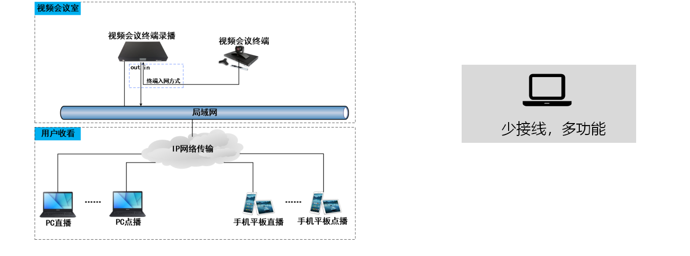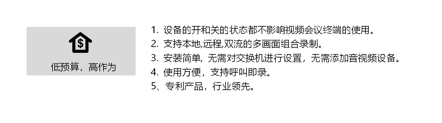現在有的視頻會議室錄播解決方案,基本上是用硬盤錄像機、模擬錄播等設備對視頻議終端的輸出進行二次編碼來實現的,其缺點是二次編碼圖像和音頻效果都會差,而且接線復雜,終端本身不具備輸出本地音頻的功能,需要額外添加音頻設備. 錄制管理復雜, 每次都要進行開始錄制的管理。