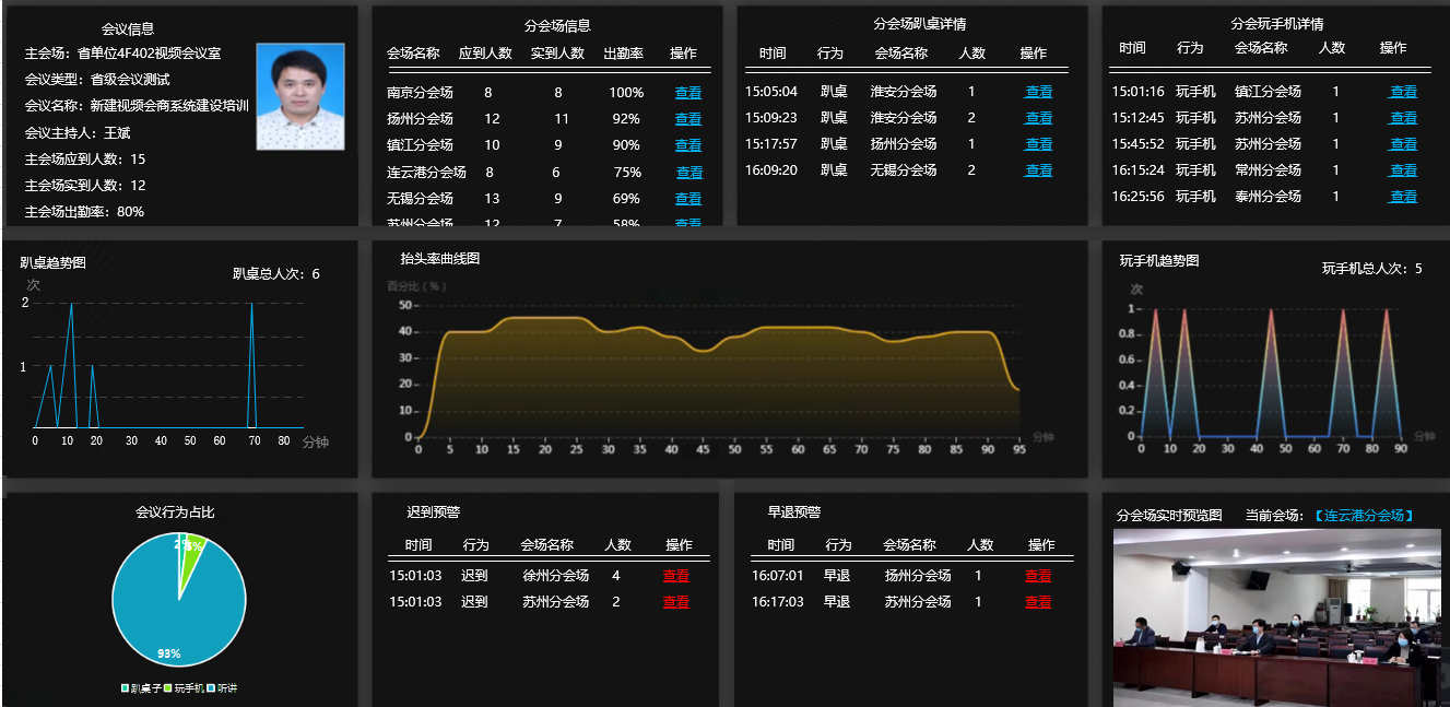該系統的發布旨在通過利用先進的AI人工智能技術,實時監測會議參與者的行為舉止,對出勤率、遲到早退、趴桌子和玩手機等情況進行智能識別與監控,借助這一系統,會議主持人和組織者可以更加準確地實時了解遠程會場參會者的紀律情況,方便對所有遠程會場同時進行會場紀律關聯,提高會議的效果。
