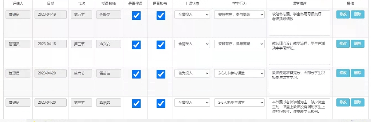 ②AI督導巡課模塊將教學管理和督導電子化、數據化、便捷化,無紙化、不再需要巡課員紙質記錄,并且直接線上巡課,大大提供了巡課效率,并且減少了對正常授課的影響。巡課記錄表支持自動載入預設的師生行為選項,巡課員可快速勾選與實際課程相匹配的選項并一鍵保存。巡課記錄和巡課視頻,可永久保存,可根據日期和節次一鍵檢索巡課記錄。