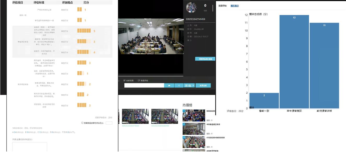 系統支持直播評課預約和,支持多模式觀摩聽課和評課,支持一鍵載入自定義評價量表進行打分,支持自主評價,支持直播時AI提供實時分析數據。