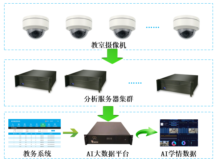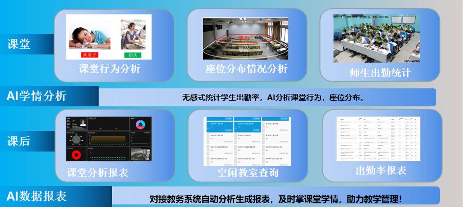 AI學情分析系統采用前端采集后臺分析的方案,前端教室可對接高清監控攝像機,如大華、宇視、天地偉業等,無需專業考勤攝像機,學生攝像機基礎要求:視場角120度,分辨率:4k,支持攝像機復用和利舊。 AI學情分析系統也支持對接常態化錄播系統,提供定制化解決方案,可直接對接錄播主機,實現圖像傳輸和分析。