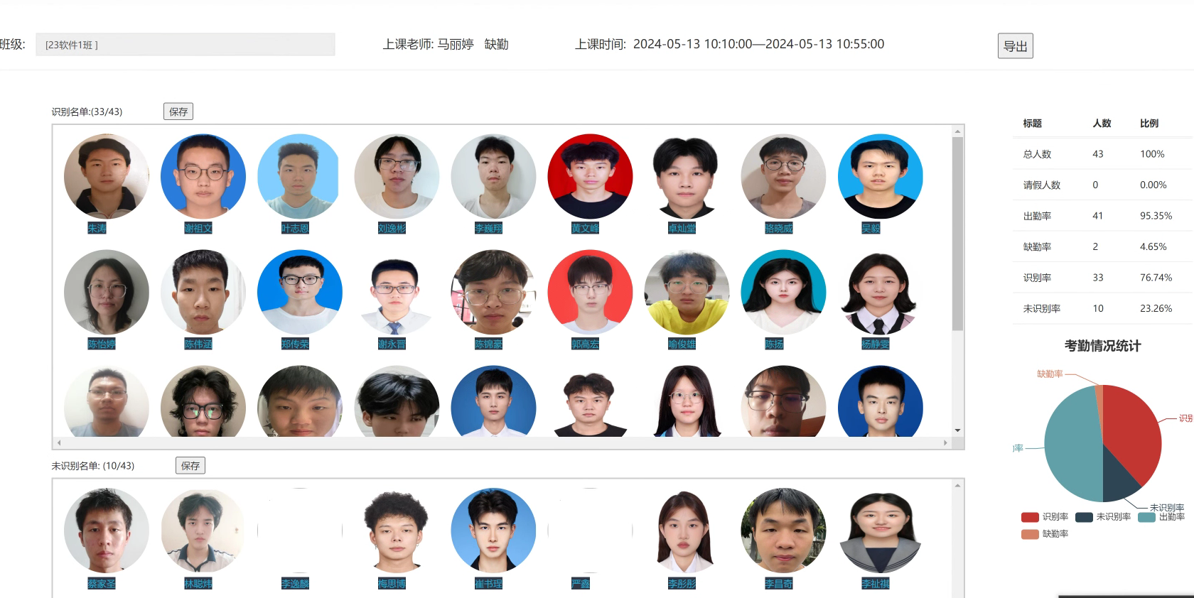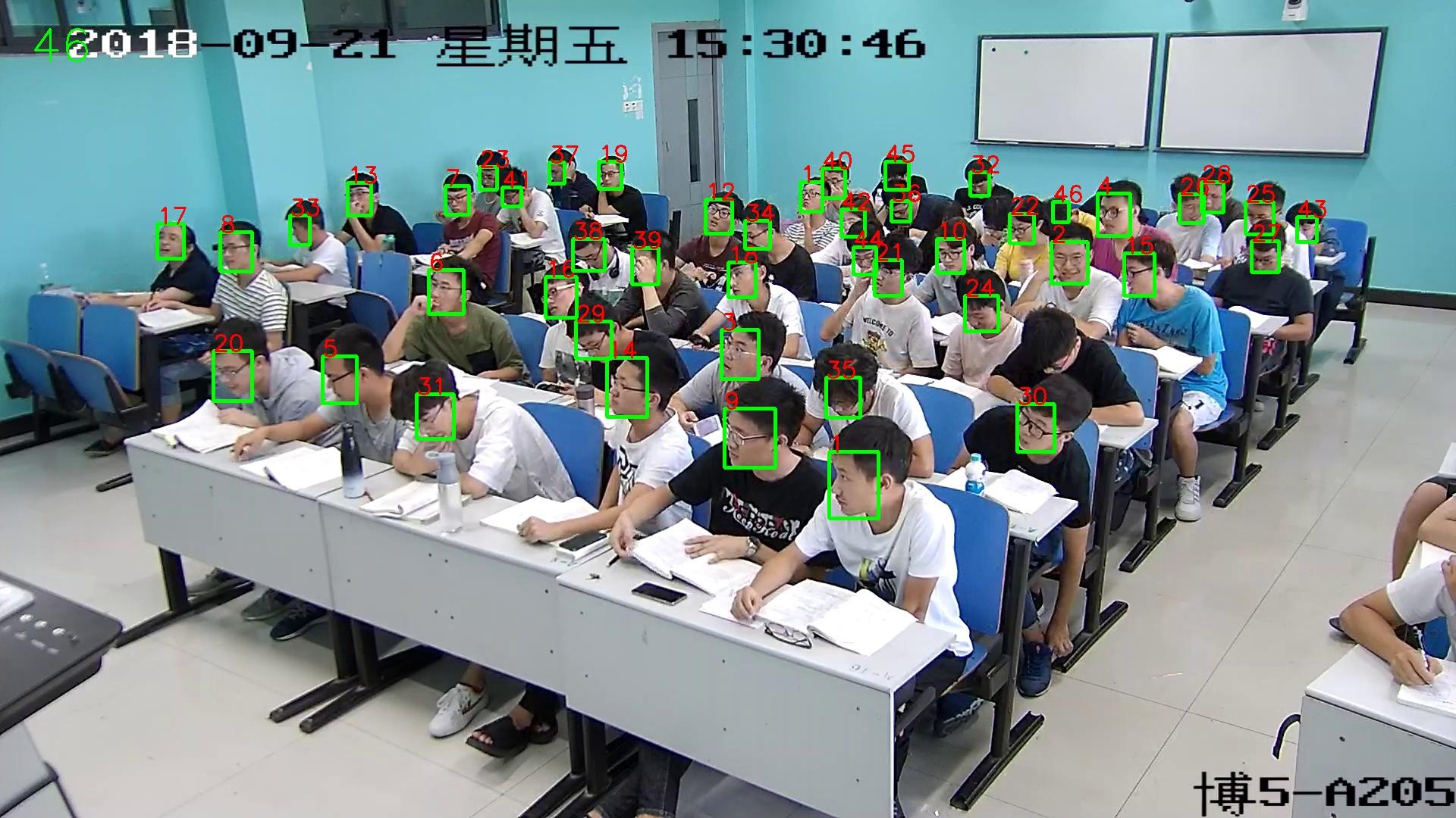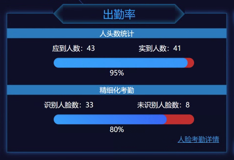 基于人數模型統計課堂實到人數,拉取教務系統應到人數后計算課堂出勤率,該算法無需人臉庫比對,可獨立運行。通過統計數據,學校和教師可以及時發現出勤率偏低的課程,及時進行干預和幫助,避免學生出現逃課等問題。在教學過程中,及時統計課堂出勤率還可以幫助教師更好地把握教學進度,調整教學方法,提高授課質量,人數統計誤差率小于7%。