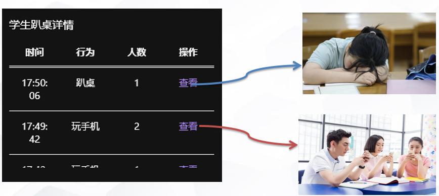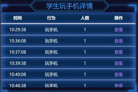 違規行為識別模塊可對課堂中玩手機和趴桌子行為進行全程抓拍,并詳細記錄每次抓拍到的時間和人數。