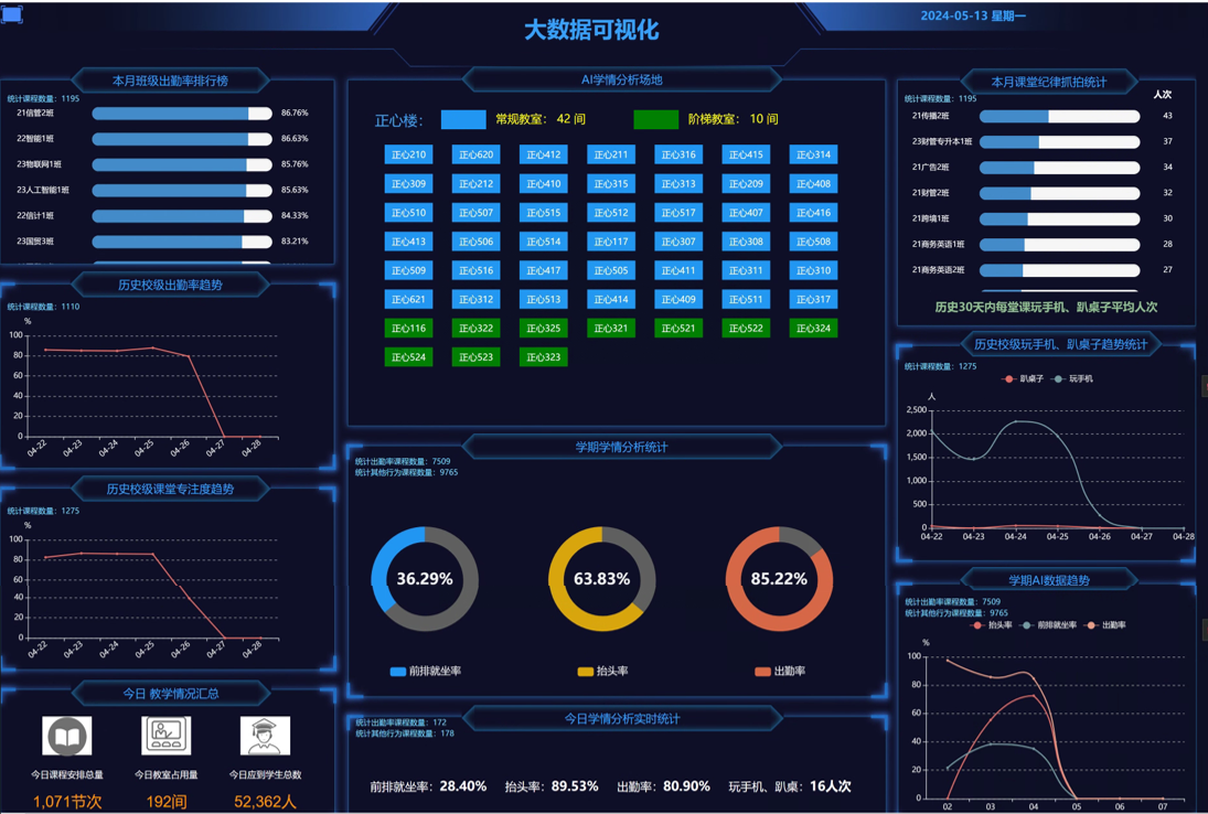 AI無感考勤(學情分析系統)數據駕駛艙頁面可集中統計校內所有教室的無感考勤數據,包括出勤率排行、違紀行為統計、專注度趨勢、校級三率綜合統計等。