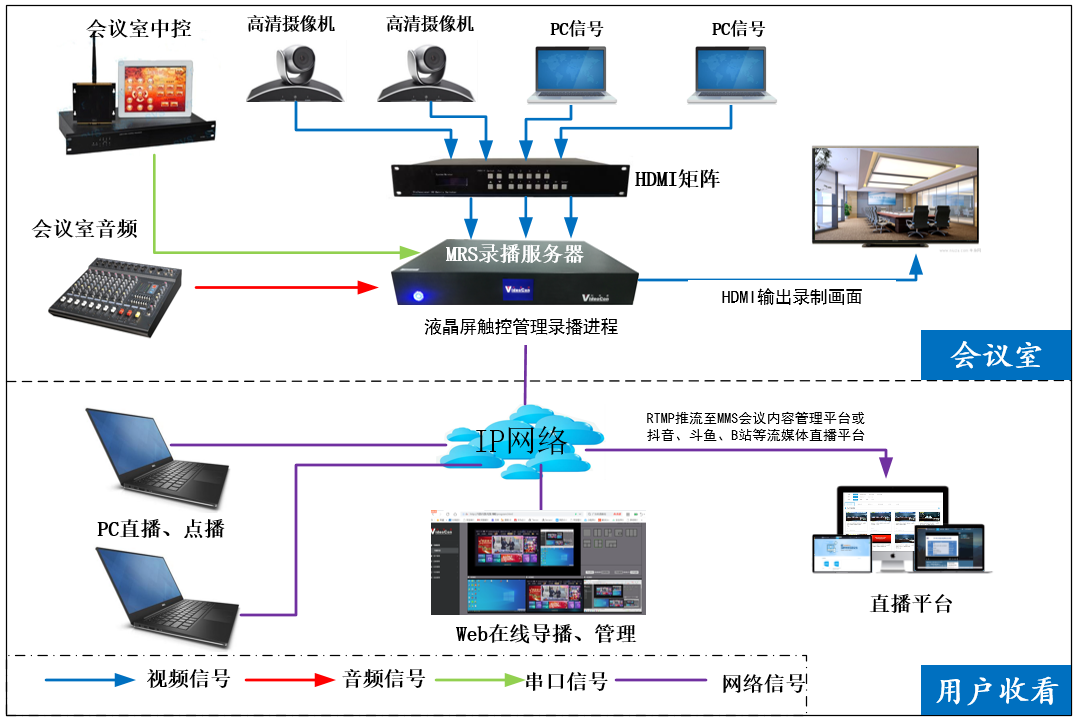 該設備支持多(不同型號選配2-4路)路高清視頻信號或者電腦信號任意組合的會議同步直播和錄制。MRS采用專業DSP編碼處理,嵌入式LINUX系統設計,安全穩定,支持7x24小時工作,單臺設備及信號采集、錄制、直播、點播、存儲一體。?